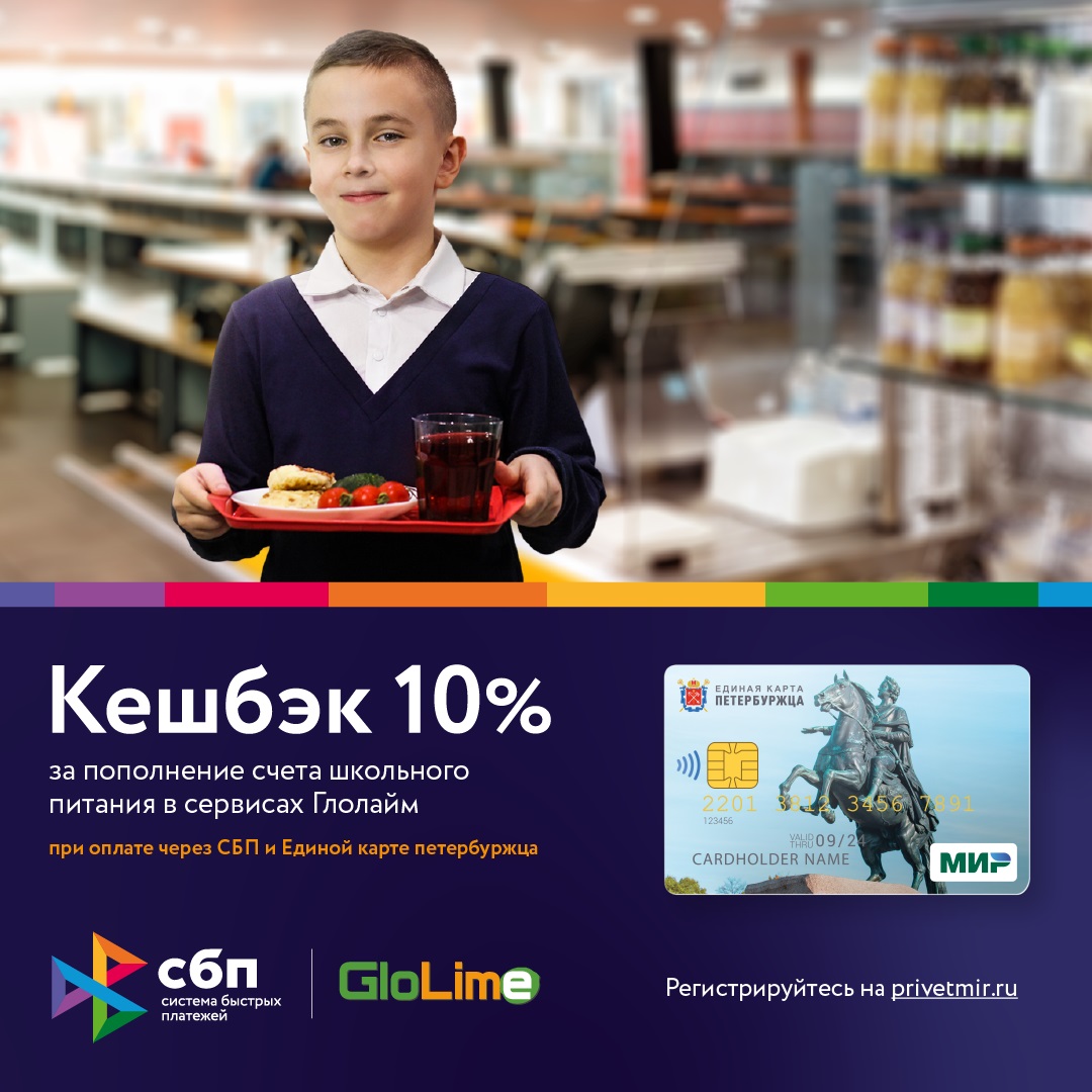 По акции предоставляется Кешбек 10% при пополнении денежных средств для оплаты питания по Единой карте школьника. Кешбек предоставляется в случае пополнения через СБП или через интернет эквайринг с Единой карты петербуржца.