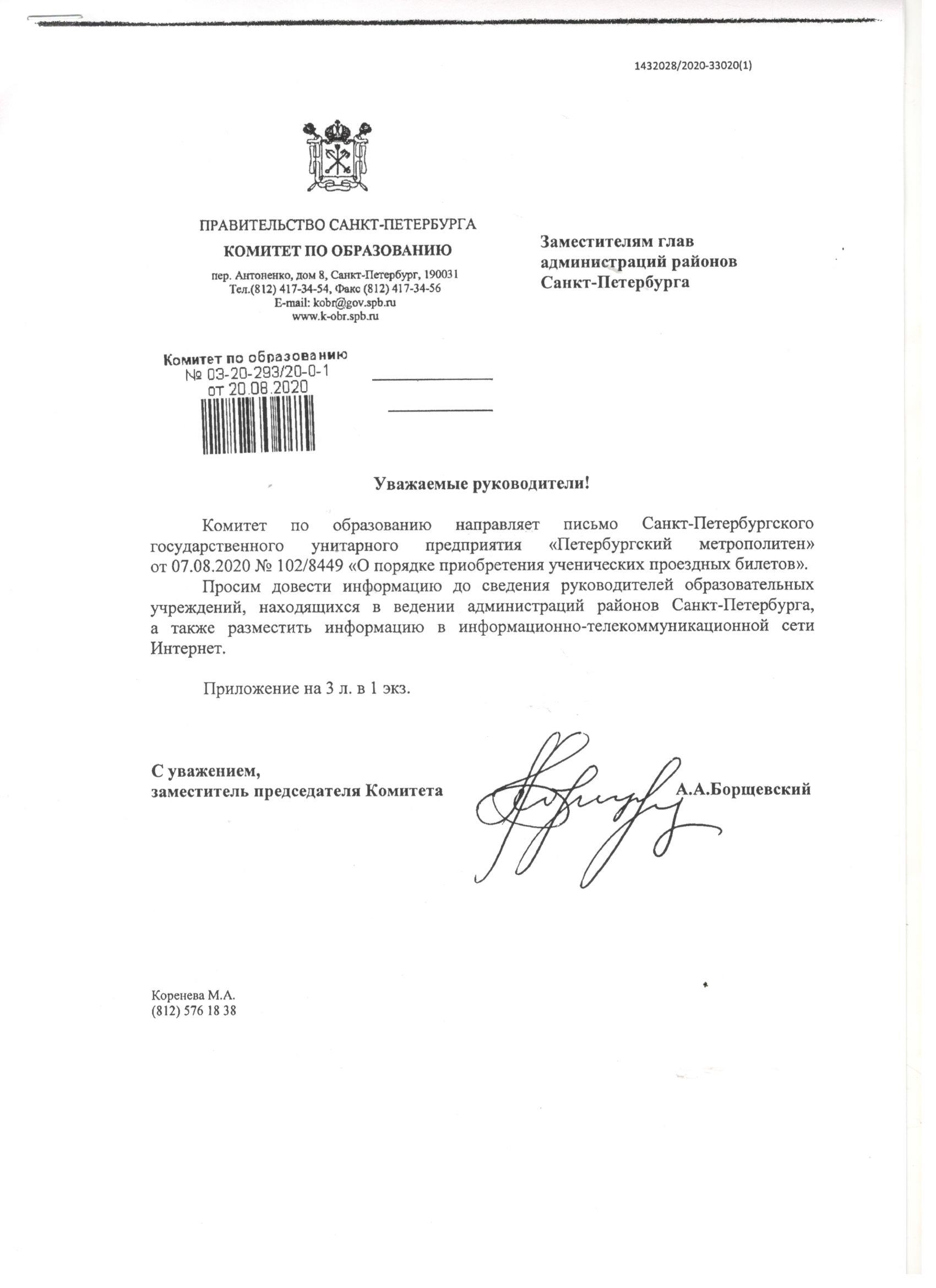Также письмо ГУП "Петербургский метрополитен" от 07.08.2020 № 102/8449 "О порядке приобретения ученических проездных билетов".