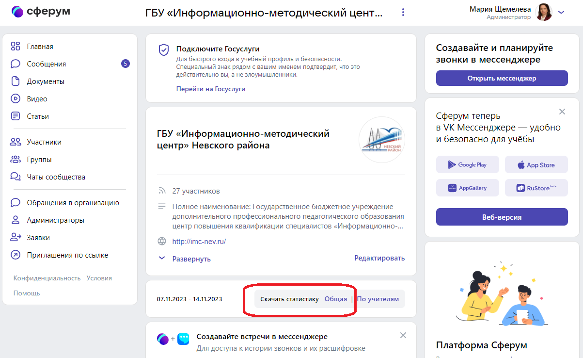 Для этого необходимо зайти на сайт sferum.ru под учетной записью администратора и скачать статистику «общая», файл с общей статистикой сохранить под именем "ГБОУ № ОО". Во вложении скриншот, где на странице учреждения в Сферум находится статистика.